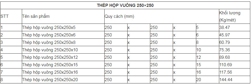 Quy cách thép hộp vuông 250×250: