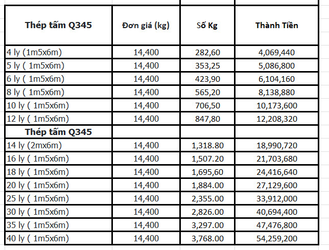 BẢNG GIÁ THÉP TẤM TRƠN Q345